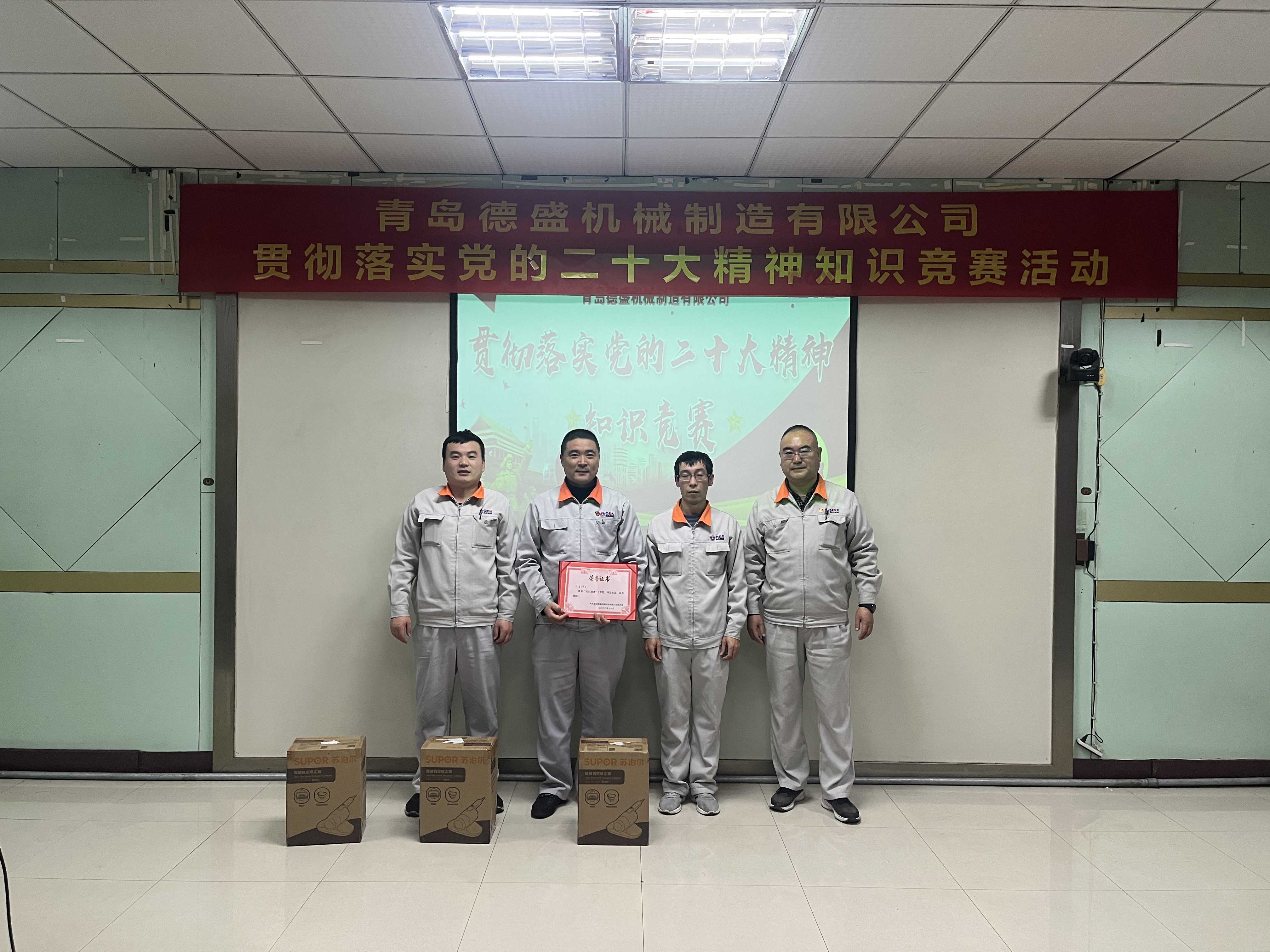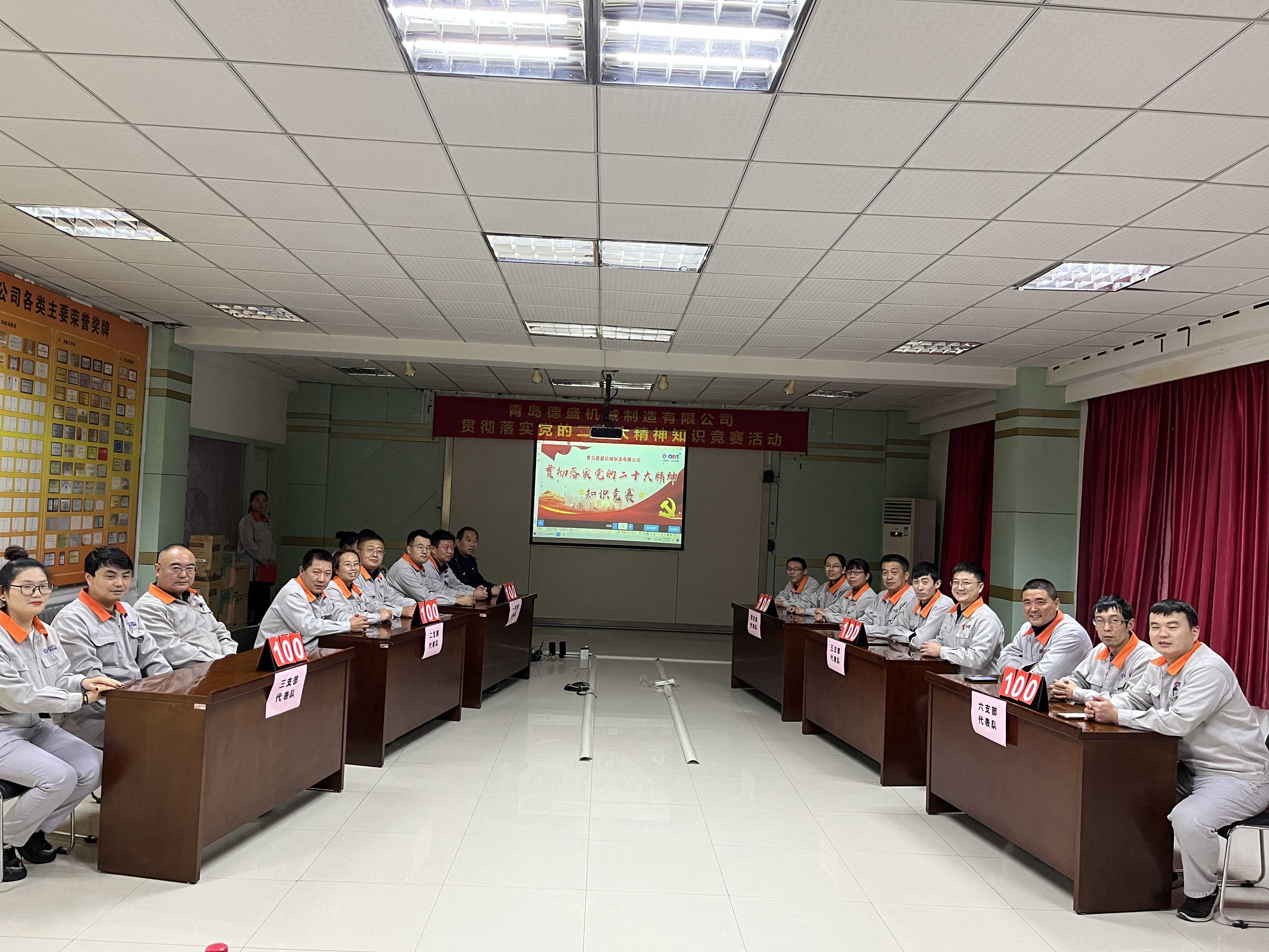 為熱烈慶祝黨的二十大勝利召開(kāi),深入貫徹落實(shí)黨的二十大精神,進(jìn)一步推進(jìn)公司黨員的思想、組織、作風(fēng)建設(shè),不斷提高理論學(xué)習(xí)水平,踔厲奮發(fā)、勇毅前行。11月18日下午,中共青島德盛機(jī)械制造有限公司黨委組織開(kāi)展了“貫徹落實(shí)黨的二十大精神”知識(shí)競(jìng)賽活動(dòng)。公司董事長(zhǎng)孫佩璋,黨委書(shū)記、營(yíng)銷(xiāo)和經(jīng)濟(jì)運(yùn)行總監(jiān)羅賽,黨委副書(shū)記、黨政管理總監(jiān)李建平,黨委委員、董事長(zhǎng)辦公室主任、黨政辦公室主任李超,黨委委員、總經(jīng)理助理、生產(chǎn)管理部經(jīng)理張錫軍,黨委委員、總經(jīng)理助理、技術(shù)研發(fā)中心主任王濤遠(yuǎn)出席本次活動(dòng)。